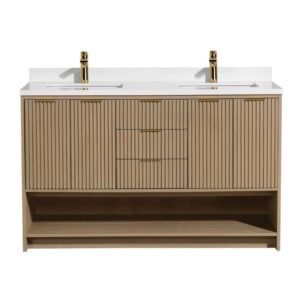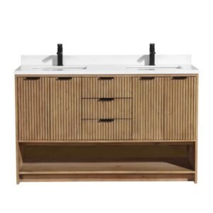 San Diego 55 in W x 22 in D x 34.5 H Double Bath Vanity in Weathered Fir with Stone Top in White with White Basin