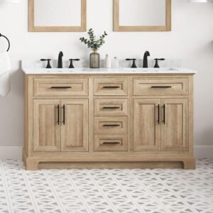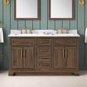 Doveton 60 in. Double Sink Freestanding Weathered Tan Bath Vanity with White Engineered Marble Top (Assembled)