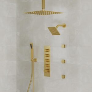 5-knobs 15-Spray Patterns 16in. Shower System with 6in. Shower Head Handheld shower in Brushed Gold, 3-Jets