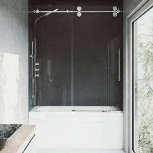 Elan E-Class 56 to 60 in. W x 66 in. H Sliding Frameless Tub Door in Stainless Steel with 3/8 in. (10mm) Clear Glass