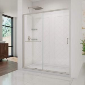 Infinity-Z 32 in. x 60 in. Semi-Frameless Sliding Shower Kit Door in Brushed Nickel with Left Drain Base and Back Walls