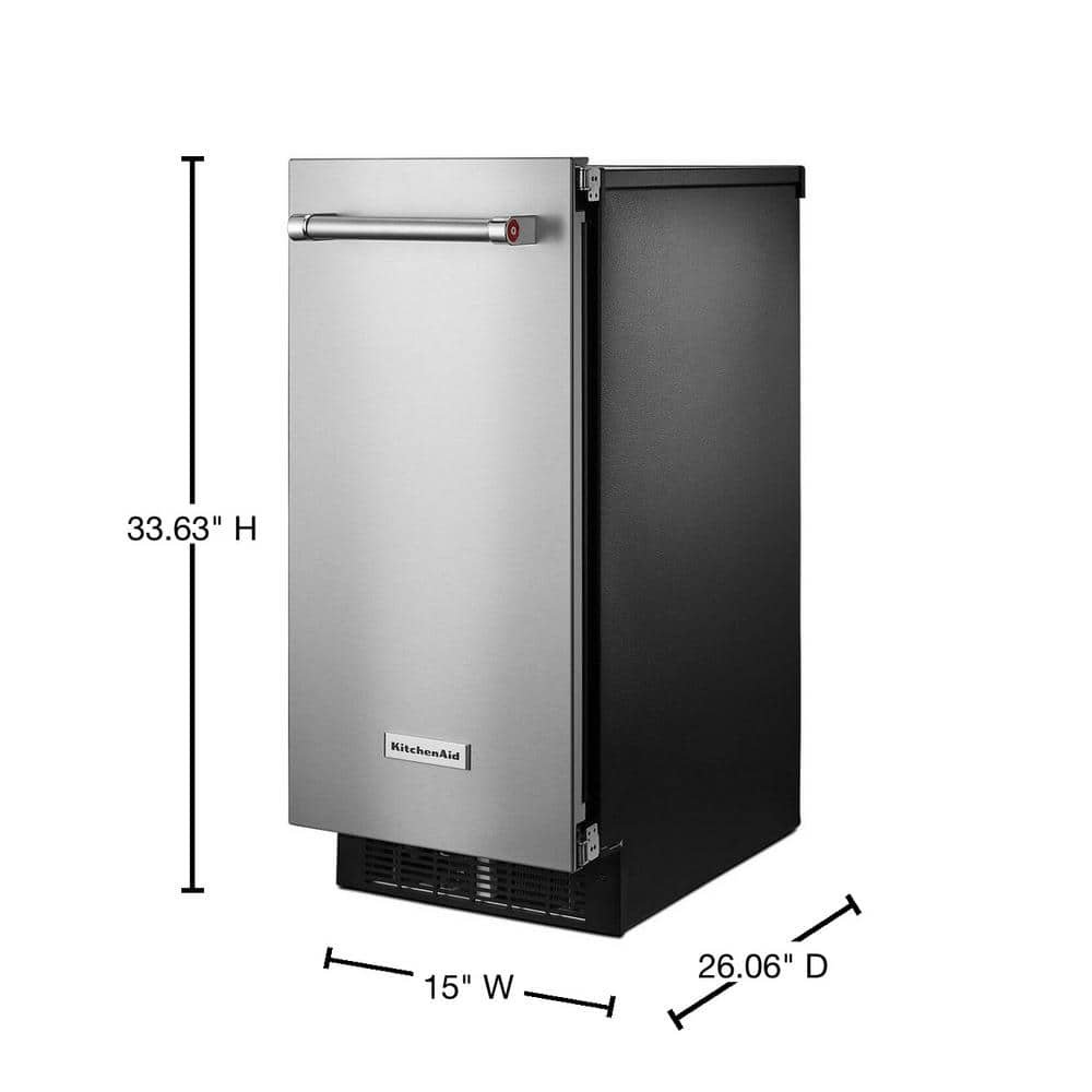 This 15 in. automatic ice maker uses Clear Ice Technology to help produce cubes of uniform shape and clarity for every occasion. Distinctive styling makes it an appealing complement to other KitchenAid appliances, with Fully Flush Installation for a built-in look. The signature handle design opens the door to reveal a storage bin that holds up to 25 lbs. of ice.