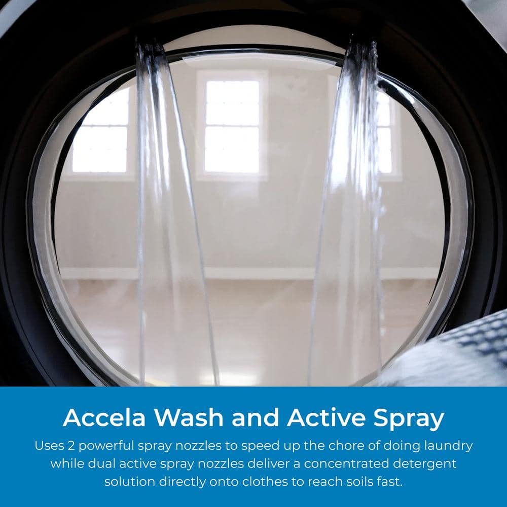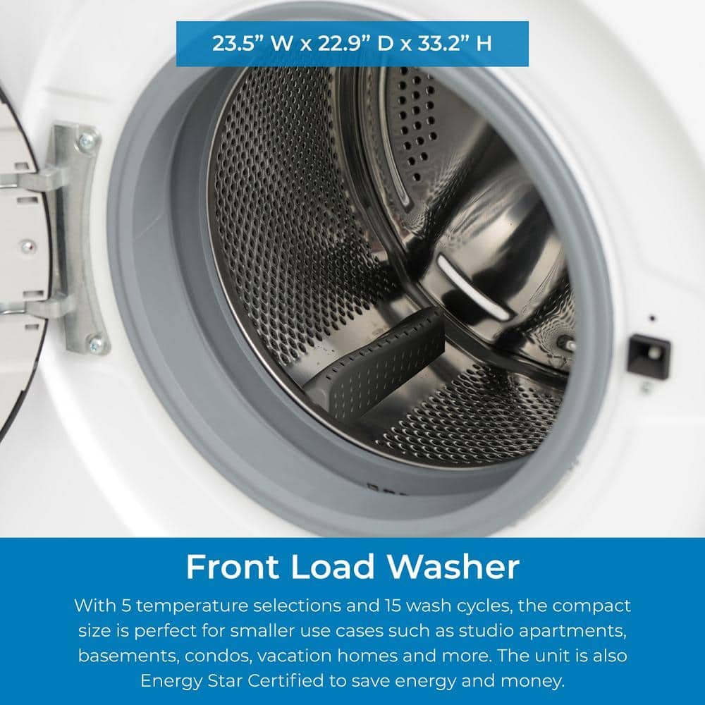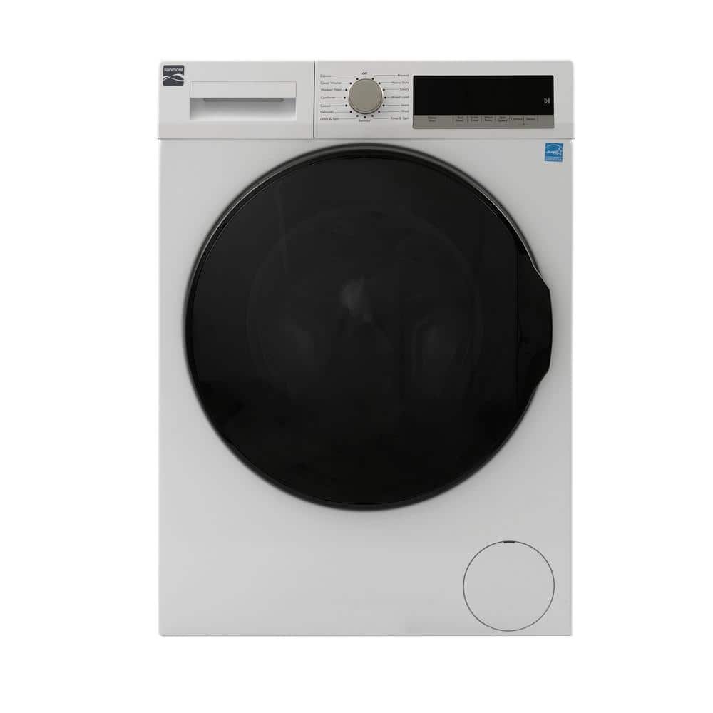 The Kenmore front load washer measures 23.5 in. W x 22.9 in. D x 33.2 in. H and puts control right at your fingertips. Designed with 15-wash cycles that allow you to efficiently wash everything from bulky bedding, jeans, towels, and delicates. 5-temperature wash selections let you choose the best temperature for each fabric type to get laundry clean while treating it with care. The Active Rinse provides fast, effective rinsing with a high-pressure Active Spray nozzle above the door that sprays fine water particles through clothes during high spin speeds. Accela Wash helps you get through laundry fast. Save time and let your washer do the hard work, the Sanitize Wash Cycle eliminates 99.9% of germs while the Steam Option also helps sanitize fabrics and allows detergent to sink deeper into your clothes to remove tough stains. This washer is also ENERGY STAR Certified, so you’ll save water, energy and money every time you clean.