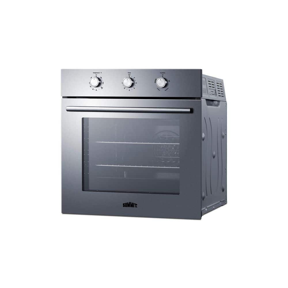 The SGW243SS is a single gas wall oven with a sleek stainless steel framed glass door and a professional handle brushed in stainless steel. 3-heavy-duty push-to-turn knobs in a steel finish provide a simple and intuitive cooking experience with clear markings for each function. The oven door includes a large window and interior light function to illuminate the interior, making it easy to monitor cooking without opening the door. The door can be removed for cleaning or service as needed. Inside, this wall oven has 2.3 cu. ft. of interior space and features enamel construction for lasting durability and easier user maintenance. 2-adjustable wire racks have 5-shelf positions to accommodate various cookware sizes. The SGW243SS offers a range of heating functions to cover virtually all of your cooking needs, including baking, broiling, convection, rotisserie, and convection plus rotisserie settings. We include a rotisserie kit with a spit fork and hook that lets you suspend chicken or other proteins from the top of the oven to be evenly rotated for a gourmet experience. The convection fan can be used with the bake or rotisserie function for even heating. This unit has a hidden bottom heating element for even baking. The oven base is removable to allow for easy cleanup. This wall oven is powered by electronic spark ignition and ships with a pre-installed 115-Volt 3-prong cord. The SGW243SS is designed for use with a natural gas connection.