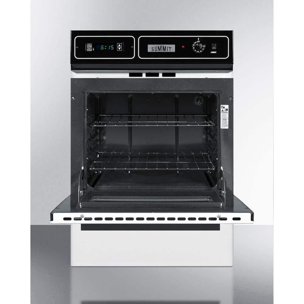 SUMMIT offers a diverse series of fully featured wall ovens with cutout dimensions of 34-1/8 in. H x 22-3/8 in. W x 23 in. D. The WTM7212KW is a white gas wall oven with electronic ignition and an oven broiler. The oven door includes a window, with an interior light for a full view. A digital clock with timer adds convenience. SUMMIT’s wall ovens have an industry exclusive height of 34-1/2 in. These units fit many discontinued cutouts such as Caloric, Slattery, and older makes, including Magic Chef. With deluxe features and a deep capacity, our wall ovens bring high quality; value priced cooking into your kitchen.