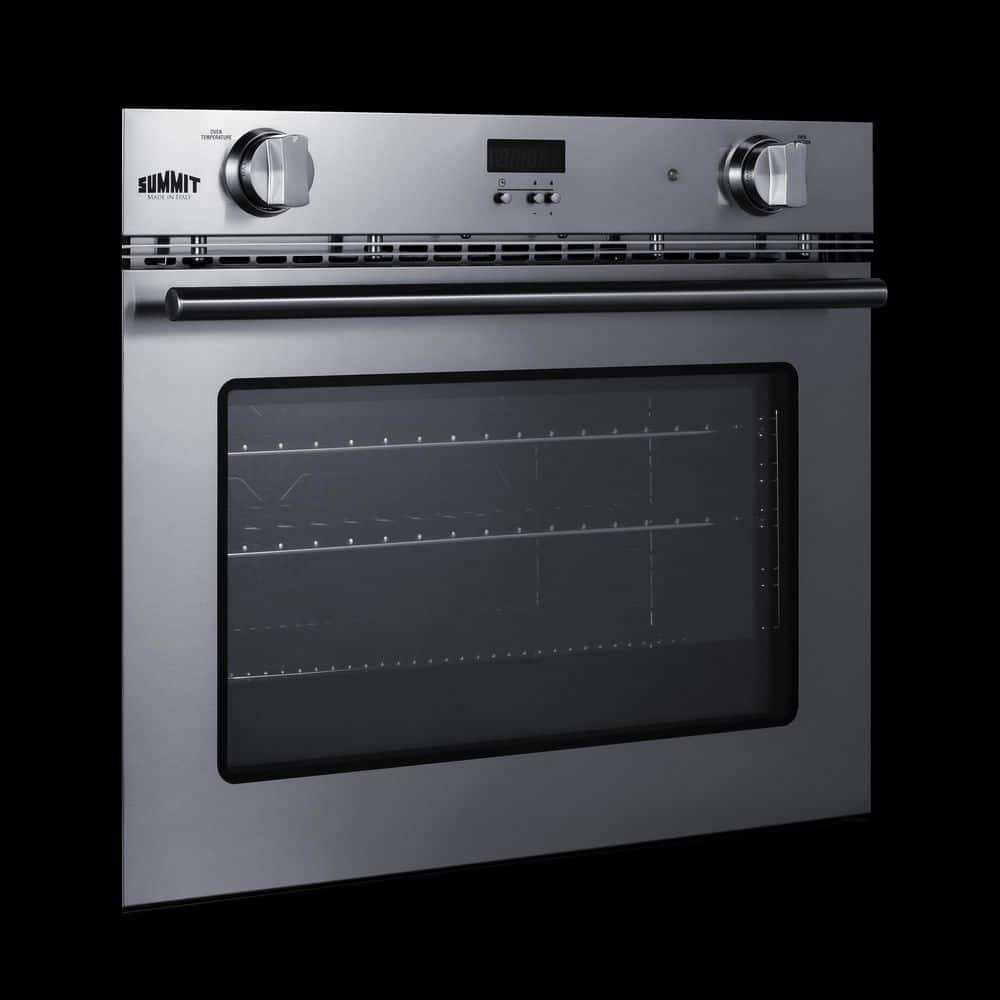 Model SGWOGD27 is just over 27 in. wide, designed for installation in cabinets with a minimum cutout size of 23.125 in. H x 26.625 in. W x 24 in. D. The exterior is fully constructed from stainless steel in a brushed horizontal grain, with a thick towel bar handle and modern oversized knobs to create a statement look. The extra large glass oven window and interior light ensure you have a full view inside the oven when cooking. The manifold includes a digital clock with a countdown timer for additional convenience. Inside, the SGWOGD27 features porcelain construction to hold up to everyday use. 3 adjustable shelves can be positioned on 5 glides. We also include a broiler tray with a removeable metal grate. The powerful 12000 BTU oven includes settings to bake and broil, with a convection fan that can be used with either function to ensure even heating on your dishes. The SGWOGD27 ships preset for natural gas but includes an LP conversion kit to adjust to propane connections. This unit utilizes spark ignition and features a pre-installed cord with a 3-prong plug. The regulator is included. With its versatile functions and stunning design, the SGWOGD27 brings European elegance to the home. Matching Italian gas cooktops are also available in 24 in., 27 in., 30 in., and 36 in. sizes.
