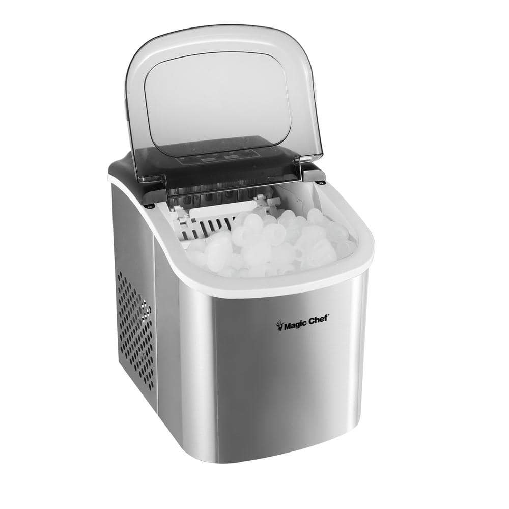 The Magic Chef Portable countertop Ice Maker can make up to 27 lbs. of ice per day, providing you with a steady supply of ice. It is just what you need to continuously fill your ice bucket or beverage pitchers when you are entertaining friends and family. The ice maker can conveniently hold up to 1.5 lbs. of ice at a time and the digital control panel indicates when the storage bin needs to be emptied. The ice maker produces ice in 2 sizes in as little as 7 -minutes. Not only do they provide a simple solution to producing large amounts of ice fast, the portable ice makers are compact and small enough to fit on your kitchen countertop or patio table.