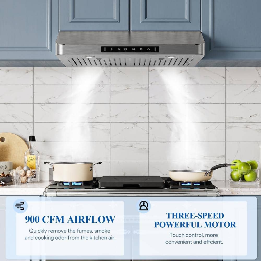 Elevate your kitchen with our powerful range hood featuring dual motors and 900 CFM suction for fast smoke and odor removal. Enjoy three speed settings, three venting options and touch & gesture control for convenience. The removable LED lighting and sleek stainless steel design enhance both functionality and style. ETL-certified for safe operation, this range hood ensures a confident culinary experience.