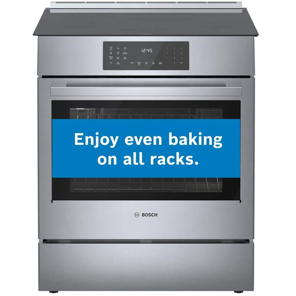 Bosch induction slide-in ranges offer consistent element temperature settings for more precise cooking results. The Genuine European Convection oven delivers faster and more even cooking on all three racks. Engineered for precision and reliability, they perform tirelessly to bring ease to every day cooking.