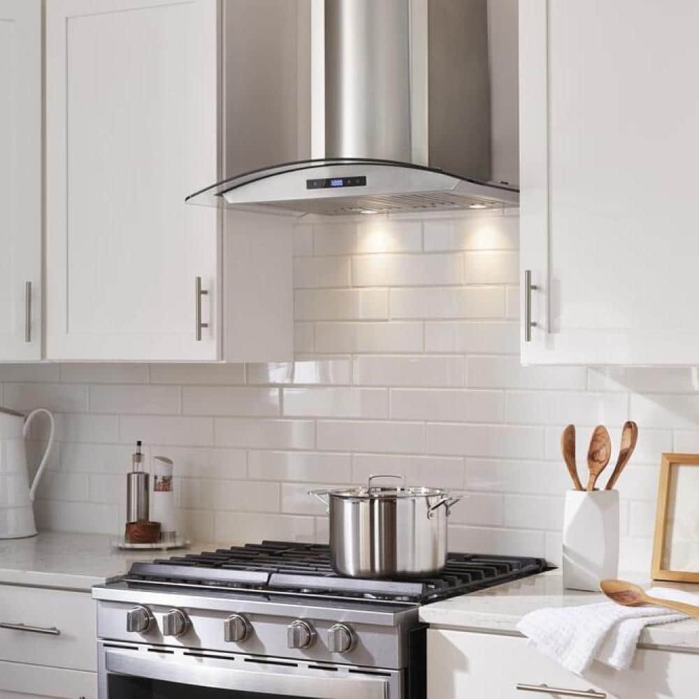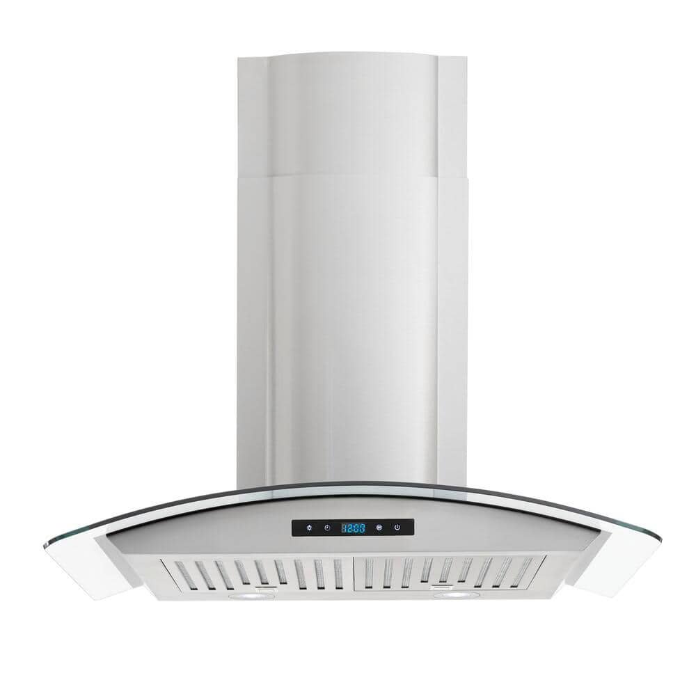 This beautiful glass wall mounted range hood will create splendor in your kitchen. Constructed of premium 430 stainless steel and clear tempered glass. Contemporary design and seamless welding. Complete with easy removable aluminum mesh filters that remove smoke and grease from your cooking area and are dishwasher safe. Powerful suction with 500 CFM air flow rate is perfect for household use and an ideal balance between power, energy efficiency and noise control. This model also comes with 2 bright soft white LED energy saver lights, low noise level operation, touch sensor control panel with 3-level fan speed, time display and delay timer shut off. This range hood comes with all the parts you need for easy installation. Adjustable chimney can fit 7.5 to 8.5 ft. ceiling. This unit is convertible, can be vented out of your dwelling or recirculating (ductless) with 2 pcs Charcoal filters to help reduce odors.(Carbon/charcoal filter,Part#1008645150)