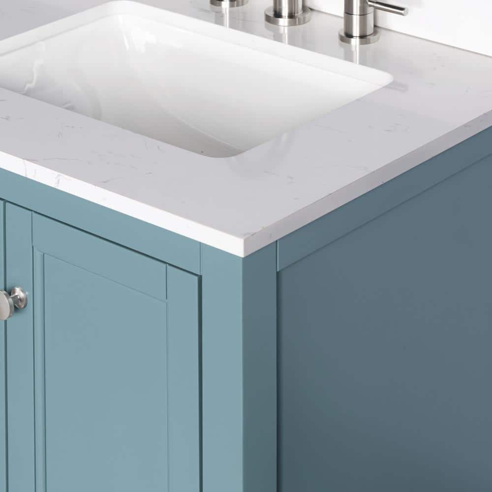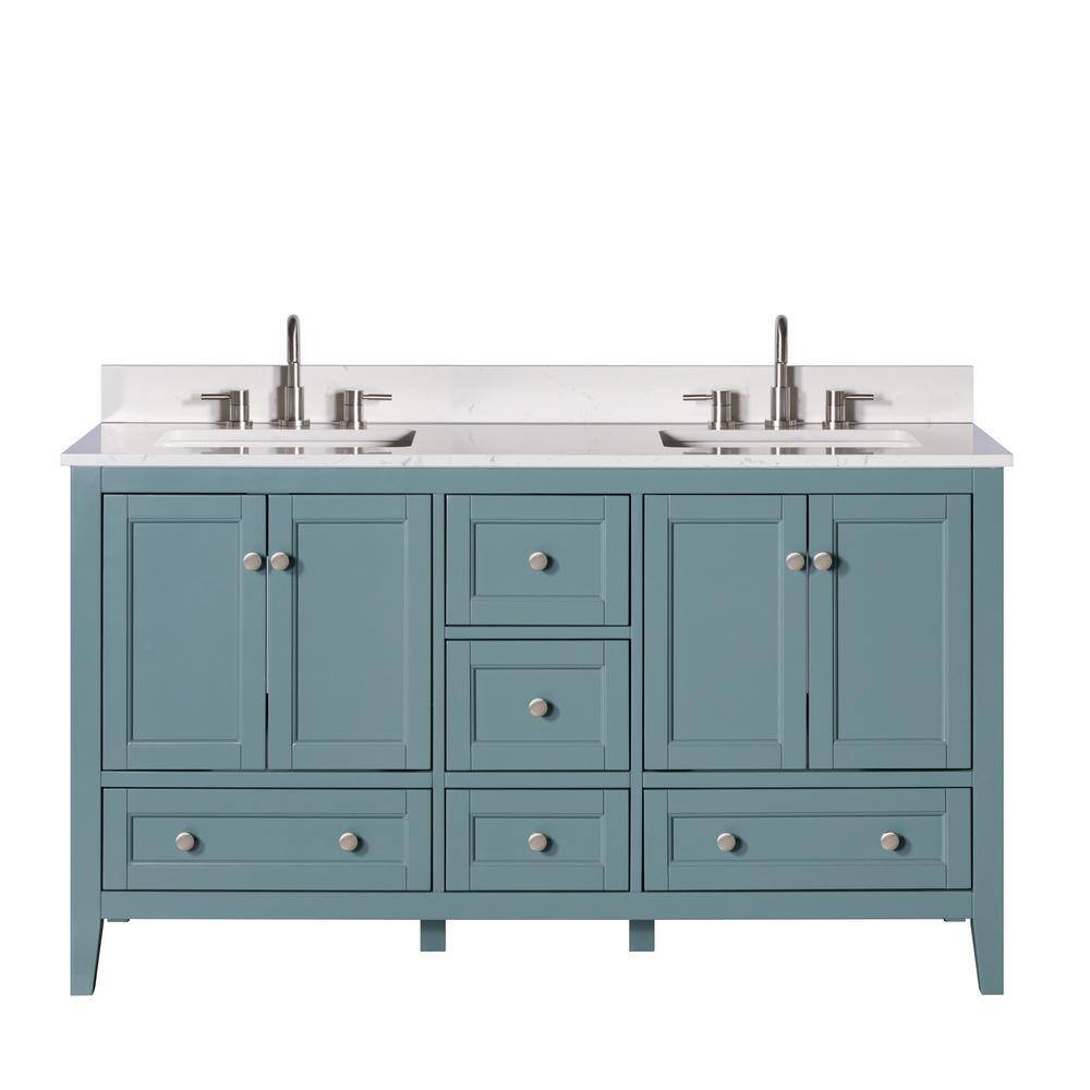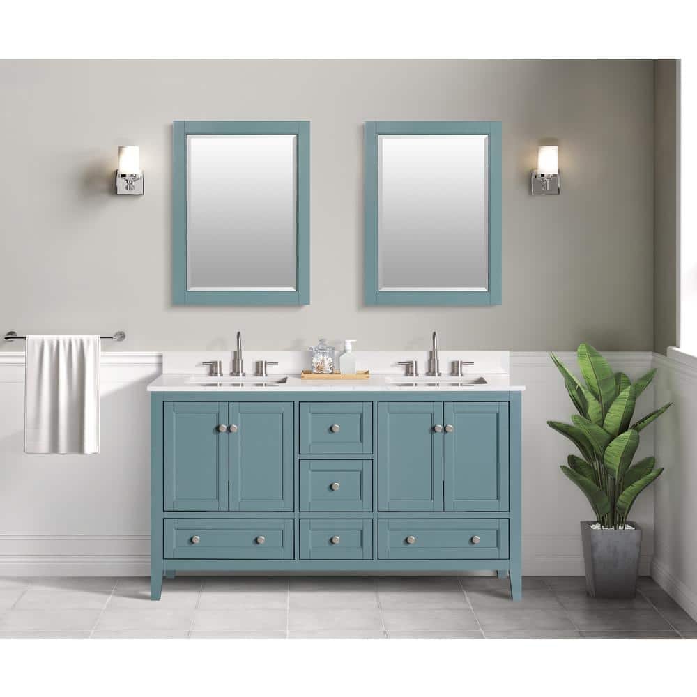 Make your bathroom beautiful with the 61 in. Beverly double vanity. The striking Aegean green cabinet finish will make you think of Mediterranean tranquility. The pure white engineered stone top and brushed nickel hardware create a satisfying contrast to the green blue hue of the vanity. Contains soft-close drawers and a solid wood frame.
