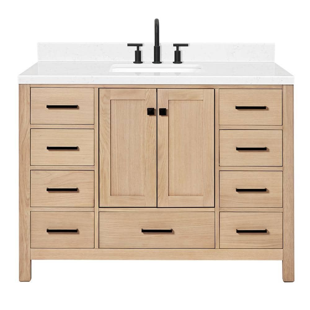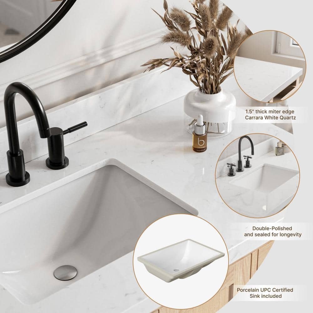 Cambridge collection from ARIEL Bath is the perfect choice for those looking for a modern bathroom vanity. Featuring quality solid oak veneer construction. This bathroom vanity with sink combines the natural warmth of wood and the elegant Italian Carrara marble or quartz countertops with metal hardware that is the perfect choice for your bathroom remodel.