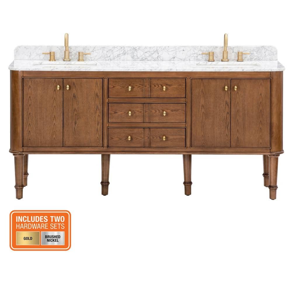 Collette 72 in. Double Sink Cinnamon Oak Bath Vanity with Carrara White Marble Top (Assembled)