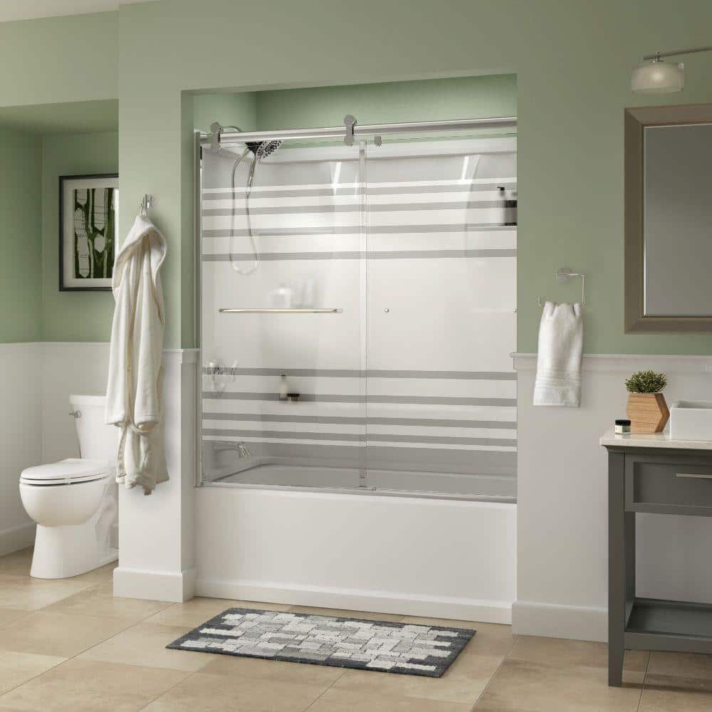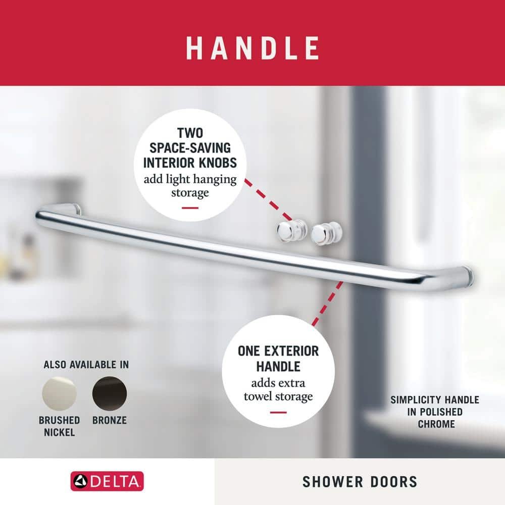 When it comes to your home, you want updates that add value, enjoyment, and last years. Customize – don’t compromise – with the Delta 1-2-3 sliding shower door program. Simply choose your glass shower or tub panel, door track, and door handle to build an enclosure that fits your taste and budget. With over 2000 design combinations at your disposal, you’ll get the premium features and design you want and nothing you don’t. A modern bathtub door with a refined industrial design, the Contemporary sliding door track has exposed rollers, slim metal trim, and a slender top track. The clean, pared-down Simplicity towel bar handles create hanging storage for towels, while two interior panel knobs act as touchpoints for sliding your doors.
