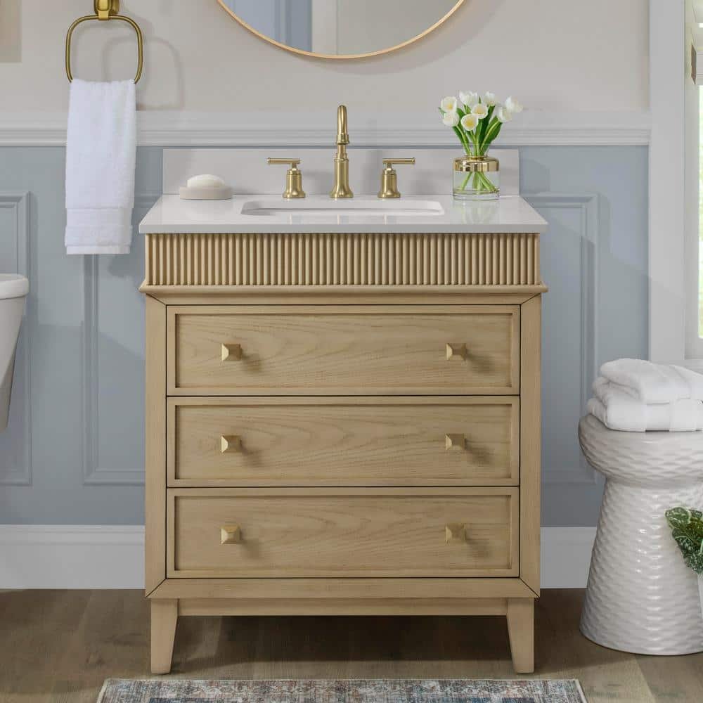 Discover elegance and efficiency with our 30-inch Single Sink Vanity. Featuring a Platinum Oak Finish that exudes warmth and elegance and sophisticated Engineered White Marble countertop, it adds a touch of luxury to any bathroom. Designed for convenience, this vanity features 3 spacious soft-closing drawers, offering ample storage for all your essentials, from toiletries to towels, keeping your space neat and always organized. The Champagne Gold knob finish exudes luxury and glamour, infusing a touch of sophistication into every detail. With an extra set of Brush Nickel knobs included, you have the freedom to customize and elevate your space according to your preferences. Paired with a sleek square basin measuring 18 inches, this vanity seamlessly blends form and function, offering both style and practicality in equal measure.