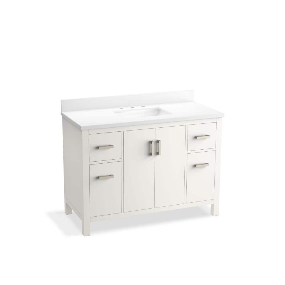The Kresla vanity collection brings a quiet sophistication into your bathroom space with its with clean, architectural lines and range of finishes and with its roomy interior, you’ll find ample storage space to keep your bathroom organized and clutter-free. The Kresla 48 in. vanity set includes cabinet, quartz countertop with matching backsplash, sink and hardware. With KOHLER, it’s easy to find the design solution that’s right for you.