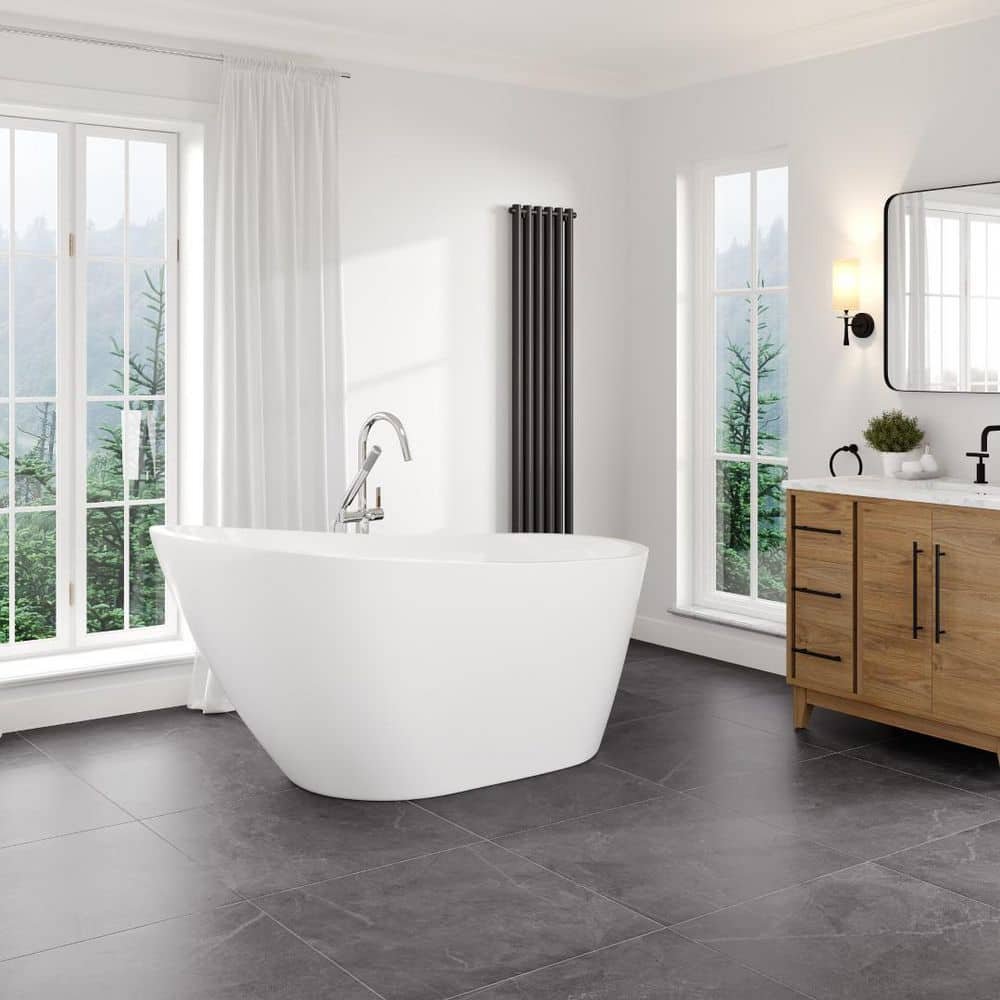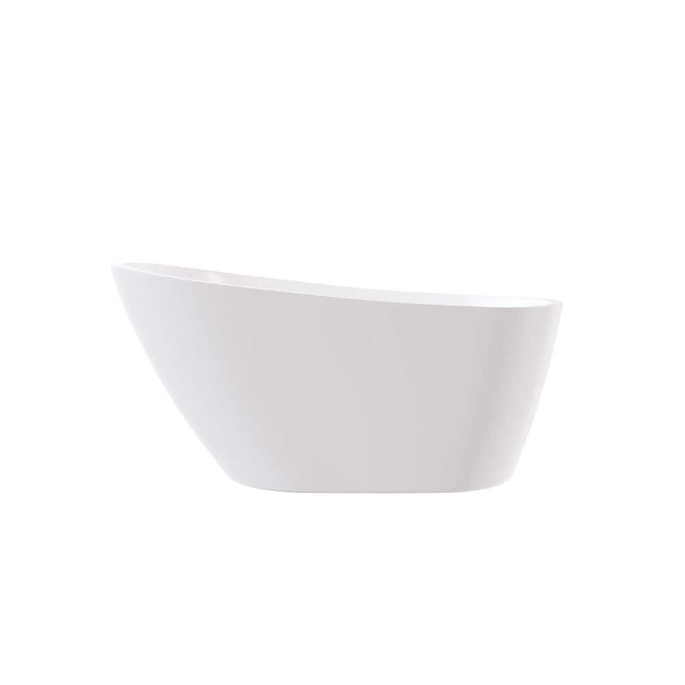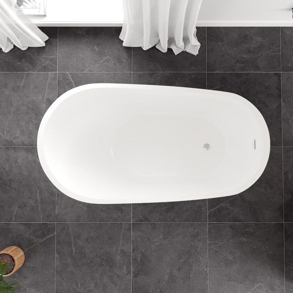 Crafted from high-quality, durable acrylic, the Eviva Luna 55 in. freestanding bathtub resists fading, scratches, and stains. This oval bathtub has a beautiful glossy white finish and features a slipper design, with the end elevated higher than the center, offering a luxurious and comfortable bathing experience. Its non-porous surface ensures easy cleaning, excellent heat retention, and prevents mold growth. It is lightweight for easy handling and installation. Features include a predrilled chrome overflow drain to prevent spillage and a drop-in drain for optimal functionality. The tub is available in 55″, 60″, and 67″ size options.