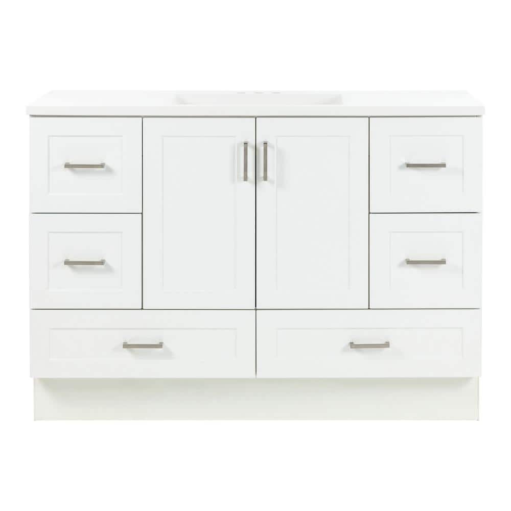 The 48 in. W Maybell bathroom vanity in white is designed to optimize storage space in large bathrooms. It features 4-full-extension side drawers and 2-half-width full-extension bottom drawers to keep your bathroom essentials organized and within easy reach. And its 2-door under-sink cabinet provides additional storage space along with easy access to your plumbing. Durably built with a laminate furniture-board box construction, this soft white bathroom vanity features shaker-style doors and drawers that are complemented by satin nickel door and drawer pulls. This contemporary bathroom vanity combo includes a 1-piece white cultured marble vanity top that’s predrilled for a 4 in. center set faucet and has a centered integrated rectangular sink. Designed for quick and easy installation around your existing plumbing, this pre-assembled bathroom vanity set features an open-back design, adjustable drawer fronts, adjustable hinges, and an unattached vanity top.