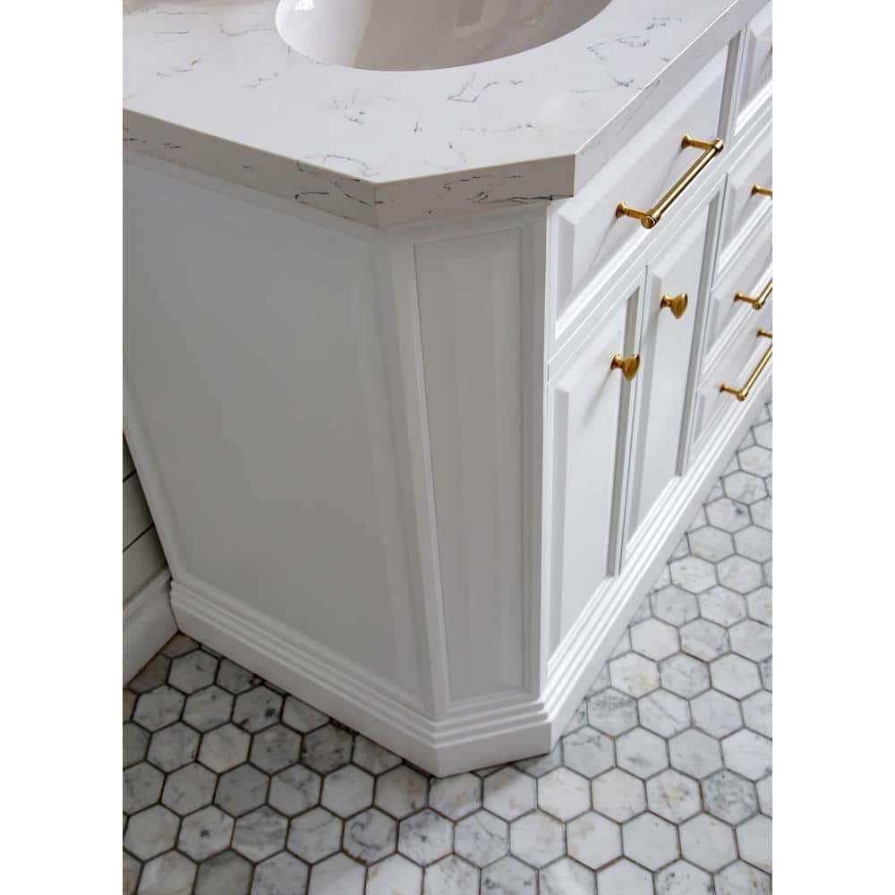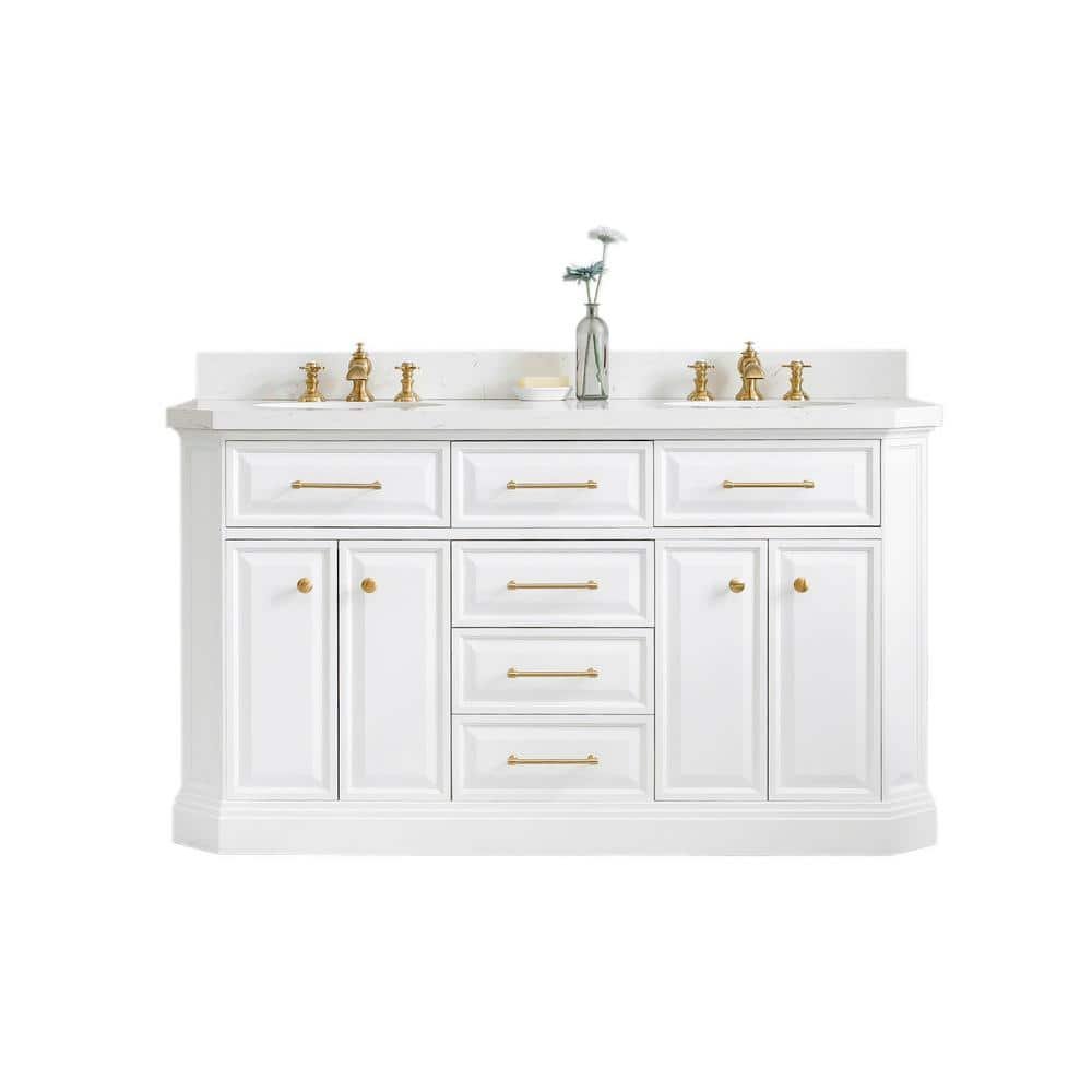 Indulge in the grandeur of Water Creation’s Palace collection, featuring the 60-inch bathroom vanity in Pure White. The majestic free-standing vanity is adorned with a 1 9/16-inch-thick Carrara white quartz countertop and matching 4-inch-high backsplash, complete with pre-drilled 8-inch-wide faucet holes for easy installation of your choice of bathroom faucet. The double undermounted ceramic sinks, along with soft-closing doors, flip-out and pull out drawers ensure a luxurious experience while maintaining top-of-the-line functionality and usability. The solid hardwood frame construction provides exceptional durability while satin gold hardware and a moulded baseboard adds a regal touch. The vanity’s elegant lines and luxurious detailing paired with modern functionality evoke a timeless chic that embodies its contemporary styling, making it a standout feature of your next bathroom project, whether it is a brand-new bathroom, remodel, or renovation. Vanity comes fully assembled for easy installation. Matching vanity mirror and bathroom faucets are available as options.