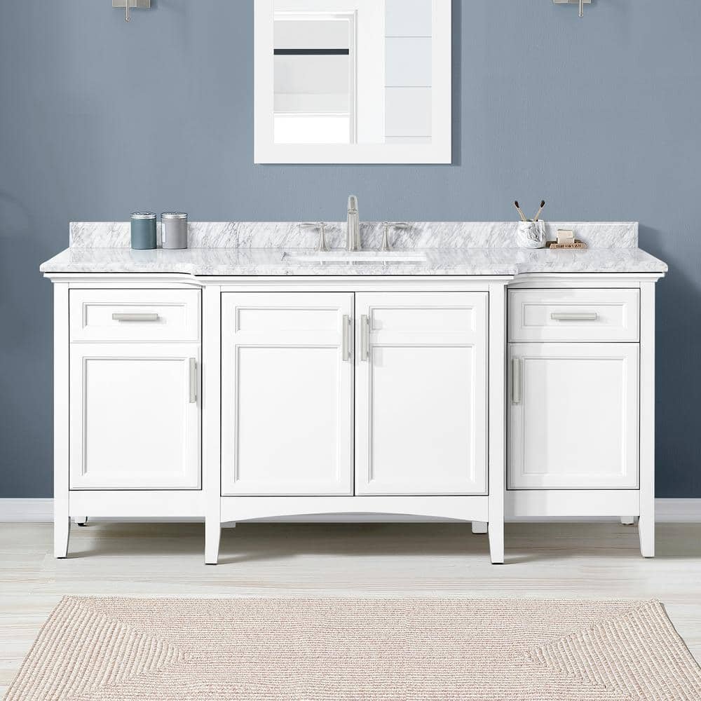 From its pristine natural Carrara marble countertop to its beautifully accented cabinet doors, the Sassy bathroom vanity by Home Decorators Collection delivers all the features wanted in a contemporary bathroom fixture. This bathroom sink and vanity features a premium-quality top with a symmetrical indented design for traditional appeal. Constructed from solid wood and painted in a timeless white finish, this 72 in. bathroom vanity has a single central ceramic sink leaves plenty of counter space while a generous mix of drawers and cabinets offers concealed storage for grooming essentials.