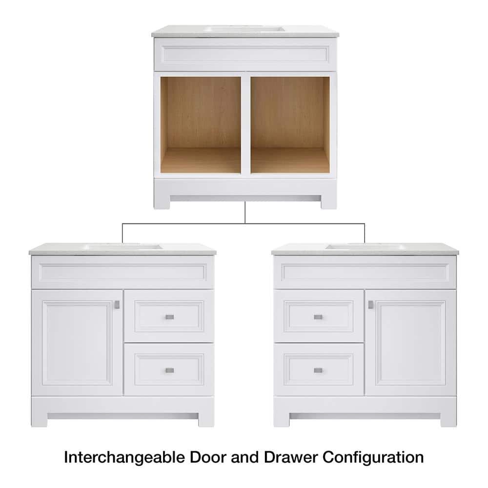 The 36.5 in. W Sedgewood Vanity in White with Solid Surface Technology Vanity Top in Arctic from Home Decorators Collection is an ideal choice for a replacement bathroom vanity cabinet. Stylish and attractive with a transitional profile, this vanity has a White finish, a durable Arctic Solid Surface Technology vanity top with white basin, a decorative toe kick and brushed nickel hardware. Additionally, the drawers and soft-close door can be swapped to be on the left or right. Pre-drilled for an 8 in. widespread faucet, this vanity will provide ample storage and has a maple finished interior for easy cleaning.