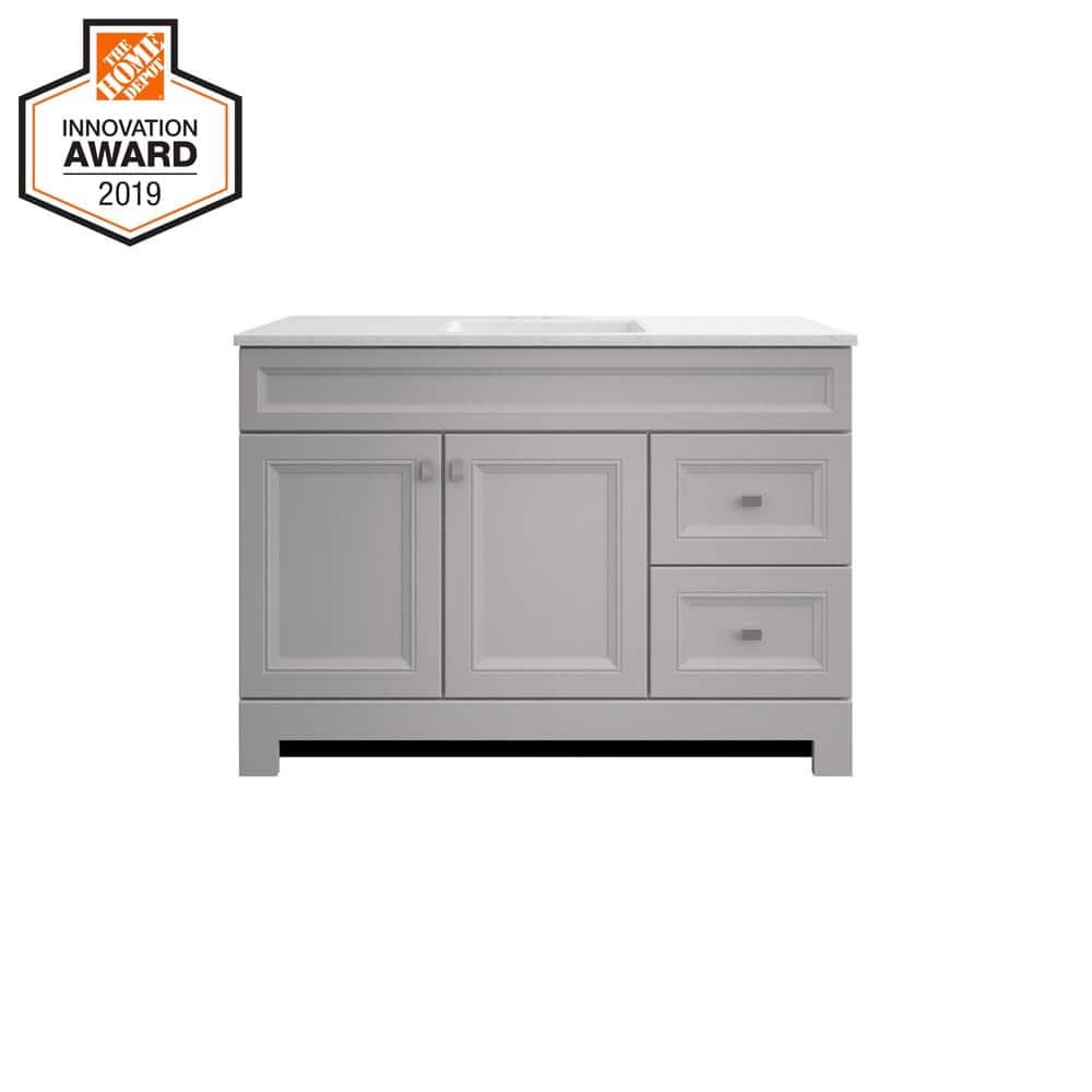 The 48.5 in. W Sedgewood Vanity in Dove Gray with Solid Surface Technology Vanity Top in Arctic from Home Decorators Collection is an ideal choice for a replacement bathroom vanity cabinet. Stylish and attractive with a transitional profile, this vanity has a Dove Gray finish, a durable Arctic Solid Surface Technology vanity top with white basin, a decorative toe kick and brushed nickel hardware. Additionally, the drawers and soft-close doors can be swapped to be on the left or right. Pre-drilled for an 8 in. widespread faucet, this vanity will provide ample storage and has a maple finished interior for easy cleaning.