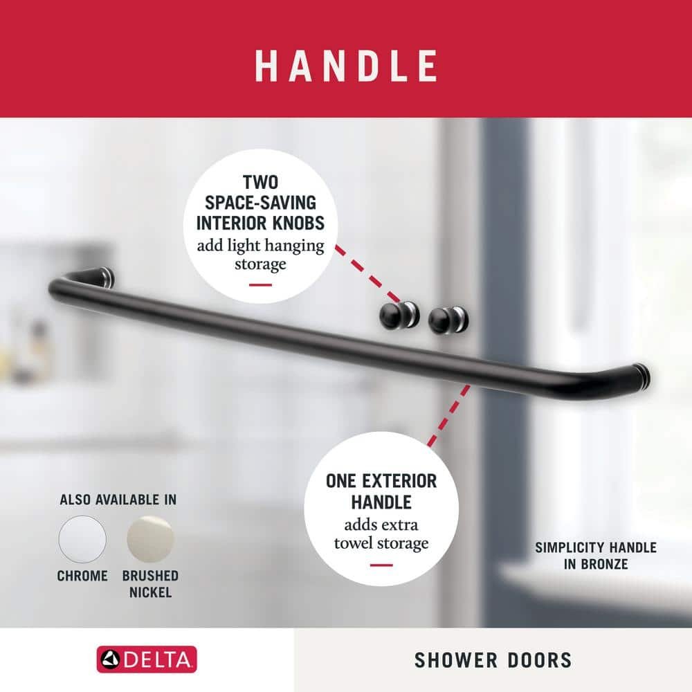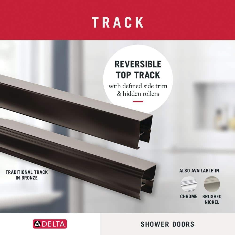 When it comes to your home, you want updates that add value, enjoyment, and last years. Customize – don’t compromise – with the Delta 1-2-3 sliding shower door program. Simply choose your glass shower or tub panel, door track, and door handle to build an enclosure that fits your taste and budget. With over 2000 design combinations at your disposal, you’ll get the premium features and design you want and nothing you don’t. The Traditional door track is a classic look with a twist – this shower door design has a reversible top track that will give you two distinct style choices. Two timeless designs in one give you options without another overhaul. Standard 6mm glass panels provide an update you can be proud of at a practical price point. The clean, pared-down Simplicity towel bar handles create hanging storage for towels, while two interior panel knobs act as touchpoints for sliding your doors.