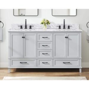 Merryfield 61 in. Double Sink Dove Grey Bath Vanity with White Carrara Marble Top (Assembled)